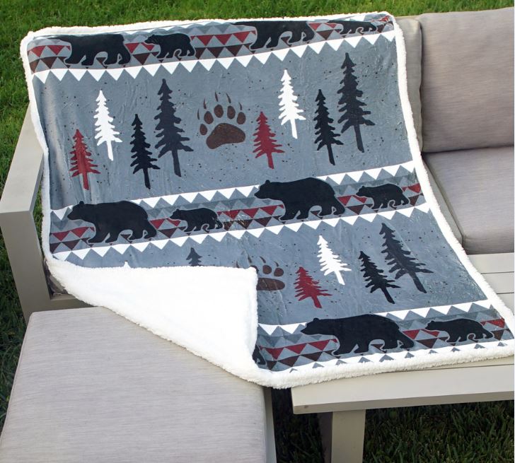 Bear Valley is a Rustic looking throw with Bears, Bear paws and Pine Trees in Black, Burgundy, Green and White on an Grey background, creating a beautiful blanket to curl up in.   This Rustic Blanket Throw is both soft & warm…a great addition to any home.