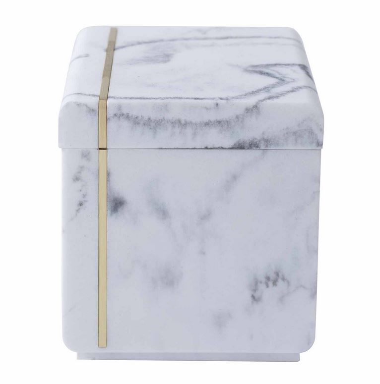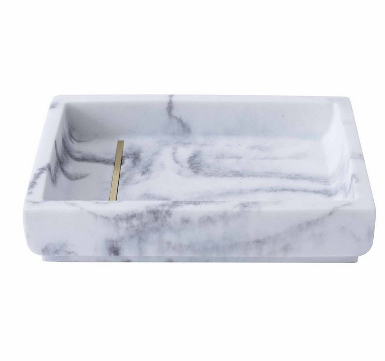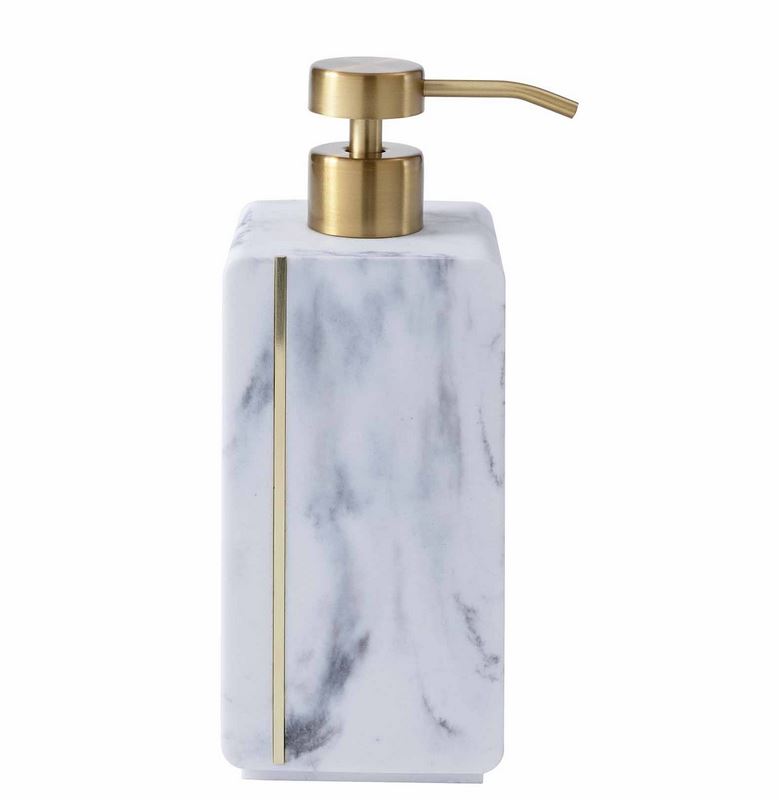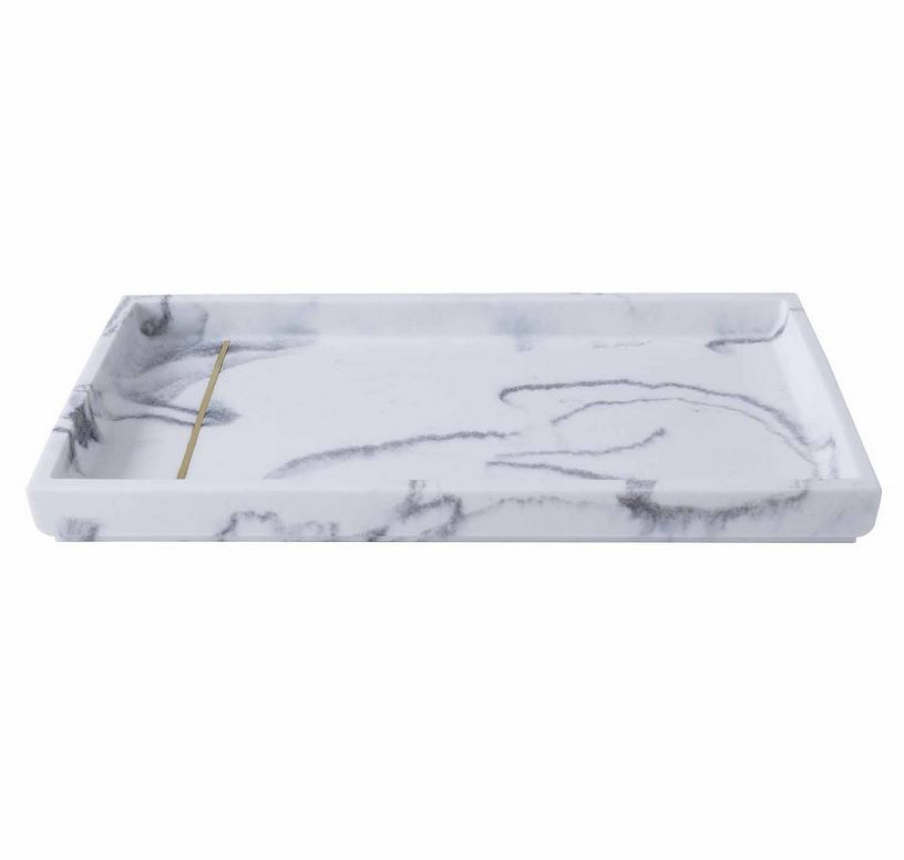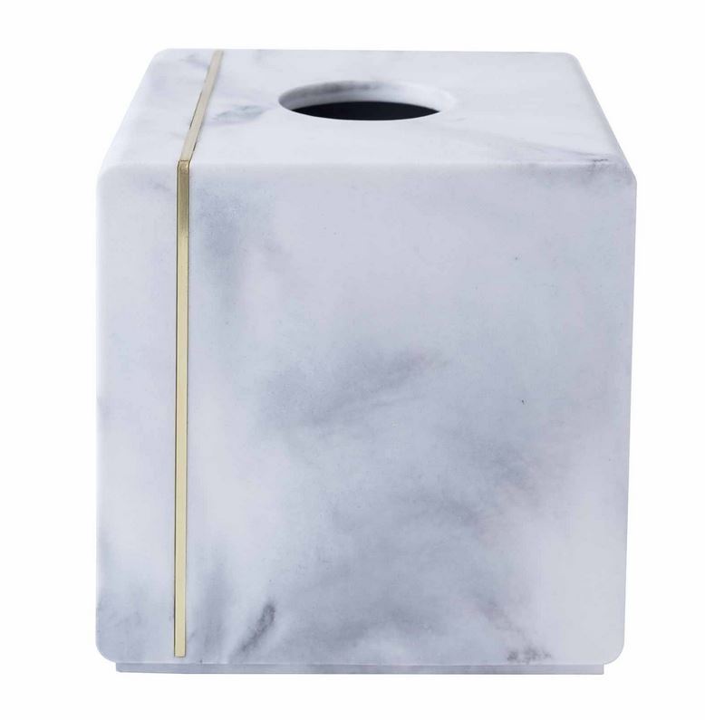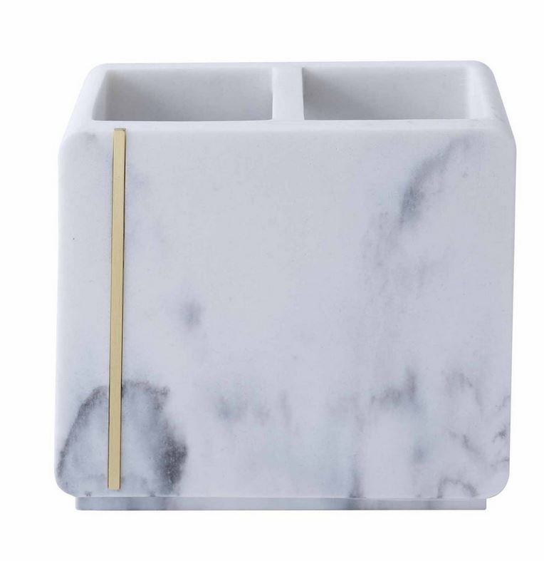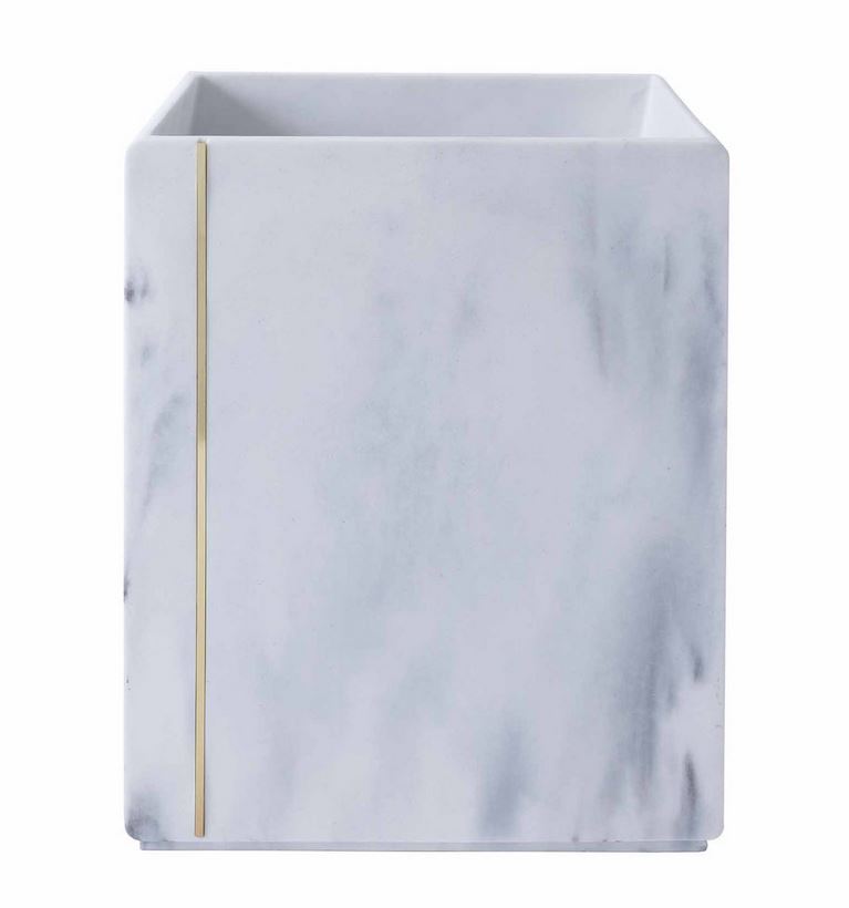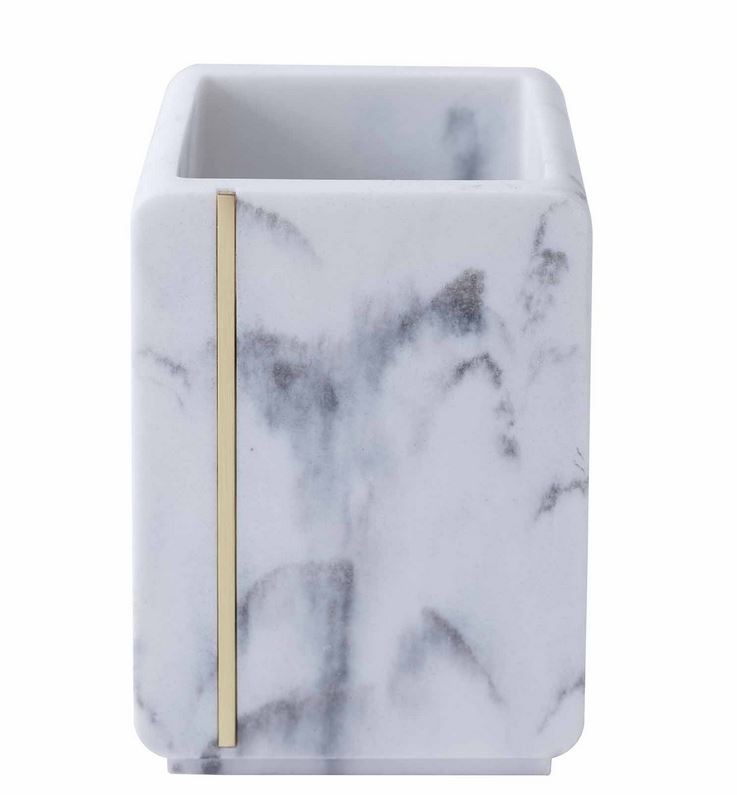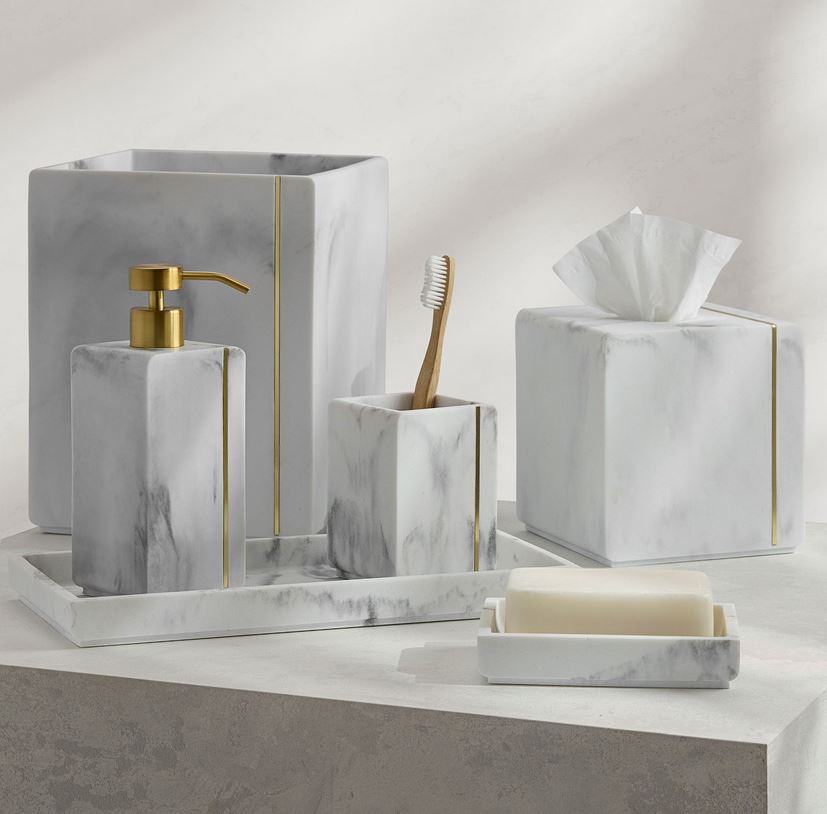 Crafted from sturdy resin and made to mimic marble, the Bergen Bath Accessories from Kassatex shine with its distinct off-centered brass inlay and cool-tones of grey and white. The waste basket, toothbrush holder, tumbler, and lotion dispenser feature the brass inlay on the front and back, while the cotton jar continues this inlay across the top lid. In similar fashion, the tissue holder also continues the inlay from each side to the top. Both the soap dish and tray feature one singular brass inlay line along the inside. Each item also features a small beveled platform, adding to this set’s grand appeal. Not dishwasher safe.