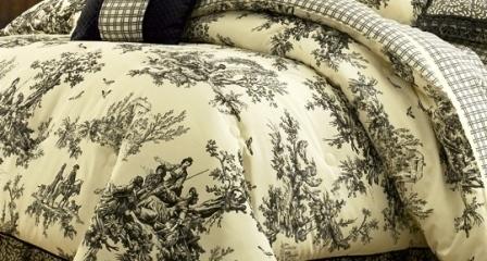 Bouvier, an exclusive design by Thomasville at Home. The Comforter ONLY feature scenes from a herders album that are sketched in Black on an Ivory ground cotton duck fabric reversing to coordinating plaid. Black piping on 3 sides. Dry Clean Only.