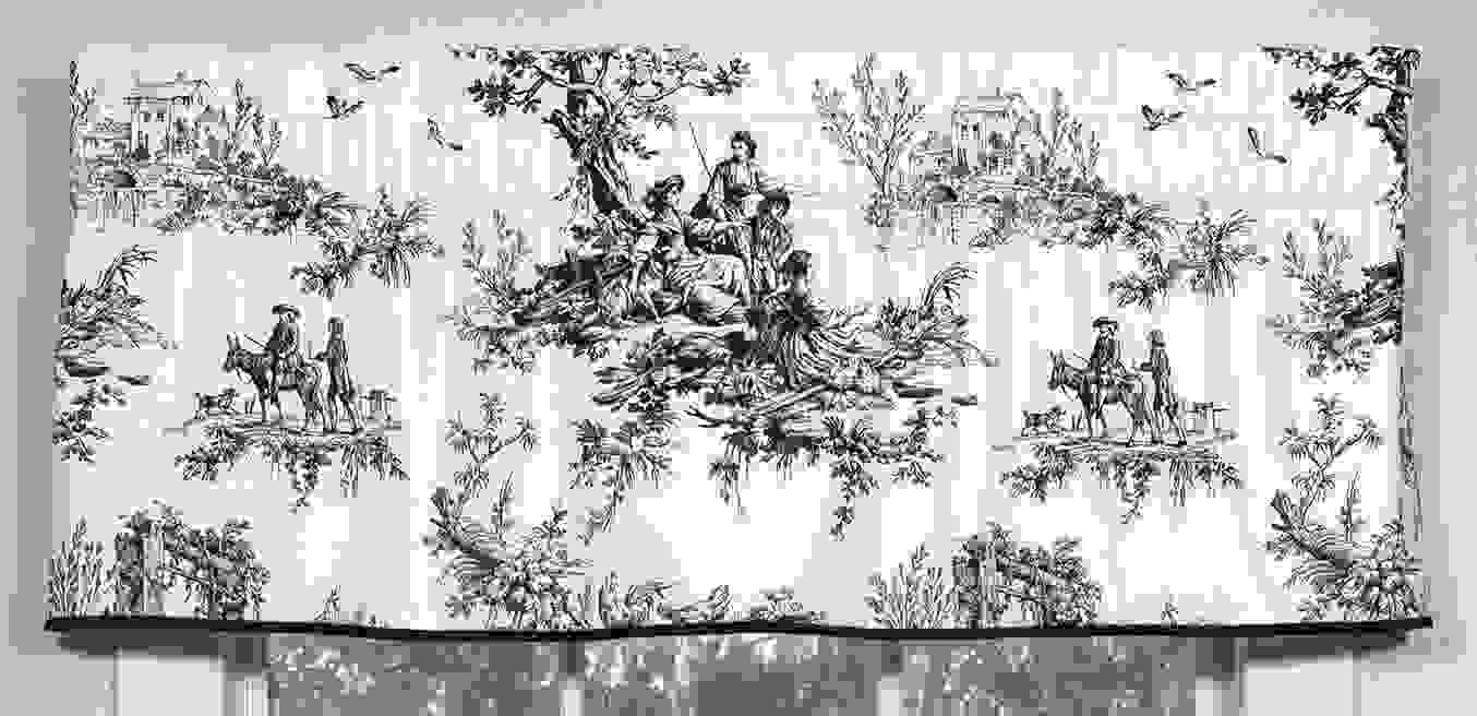 Bouvier is an exclusive design by Thomasville at Home. This Empress Scalloped Filler Valance features scenes from a herders album that are sketched in Black on an Ivory ground cotton duck fabric with black piping. Fully lined with 3″ Rod Pocket & 2″ Header. Finished size is 52″ wide x 16″ long. Dry Clean recommended.