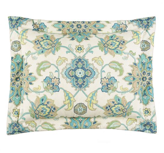 The Brooklyn II Pillow Shams from Thomasville at Home is a medallion pattern with turquoise, greens, blues, and tans. Printed on 100% cotton duck cloth with a beige/tan marble background.