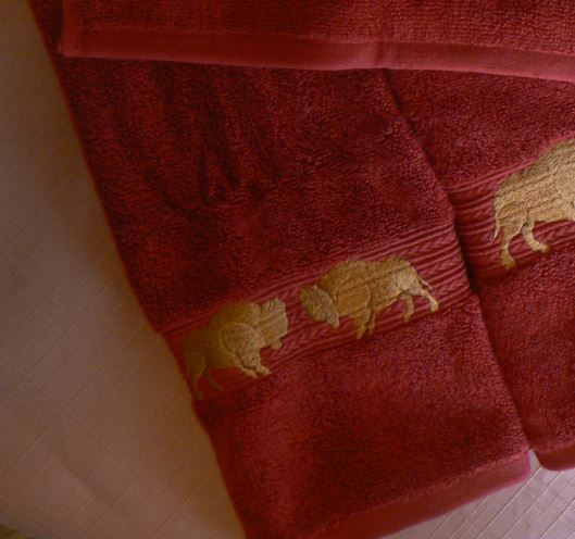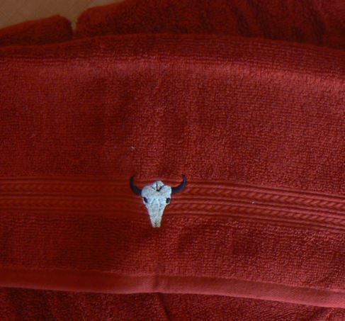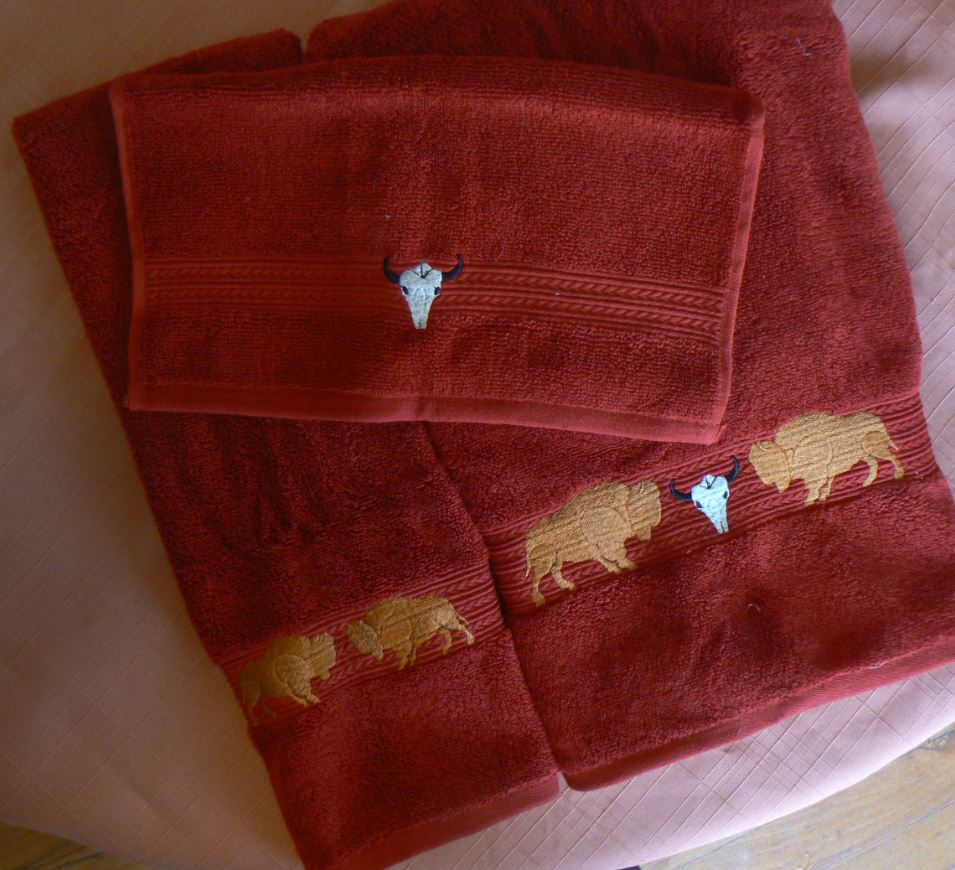 Sounds of Buffalo stampeding through the West with these looped, thick and thirsty 100% cotton towels with a pair of Buffaloes and Buffalo Skull. Machine wash cold; tumble dry low. Embroidered in the USA.