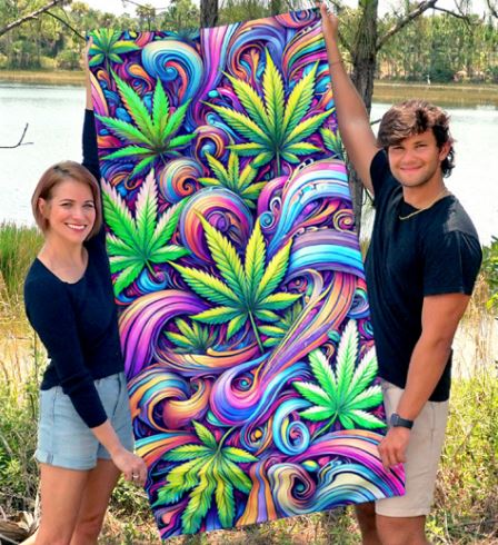 This Cannabis Beach towel from Ramatex International brings us bright colors swirling around Cannabis leaves.