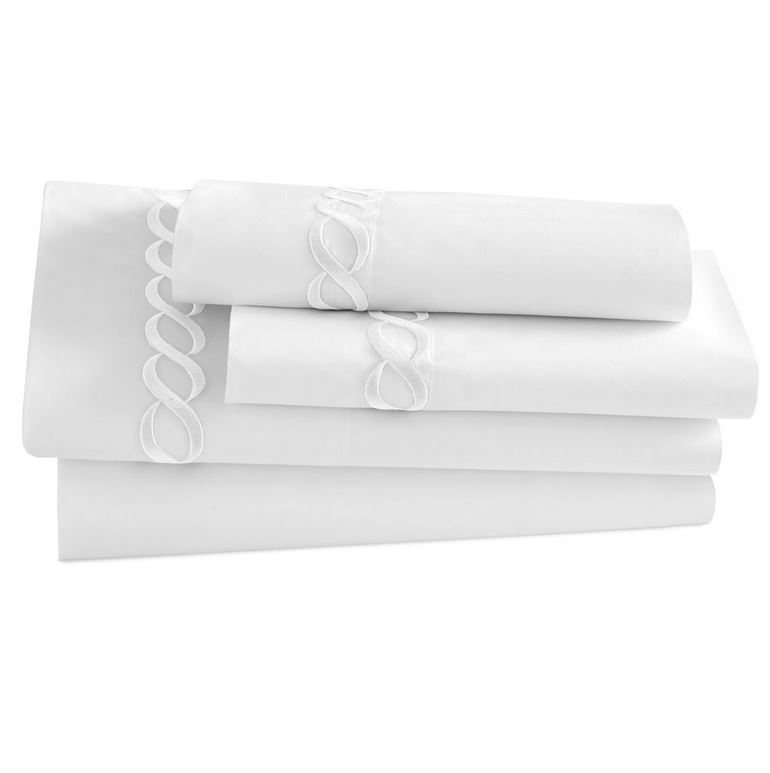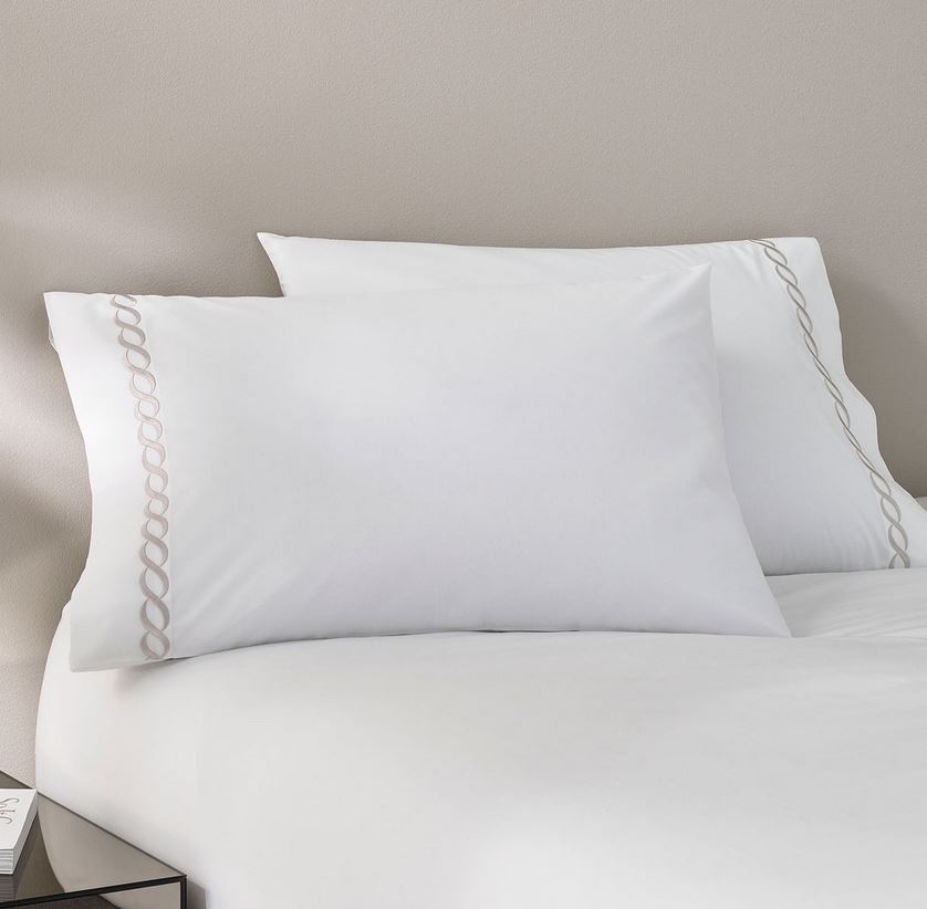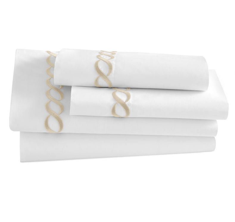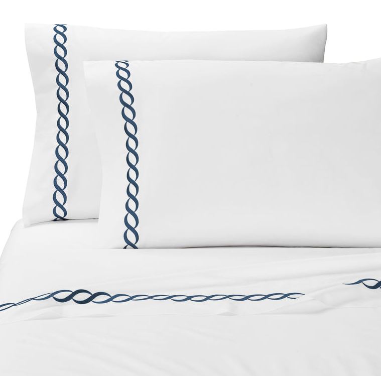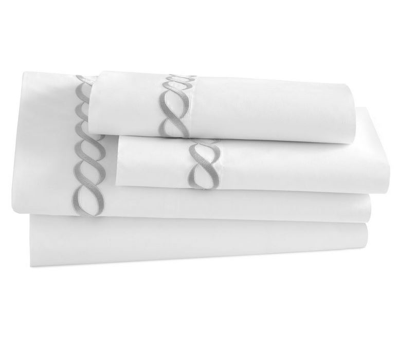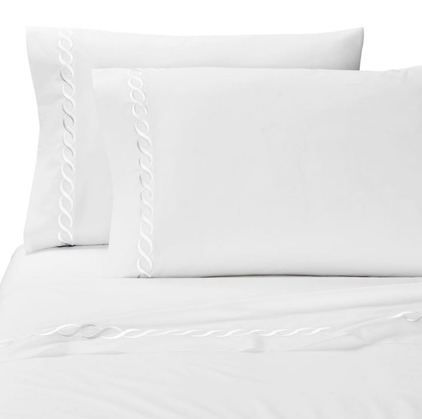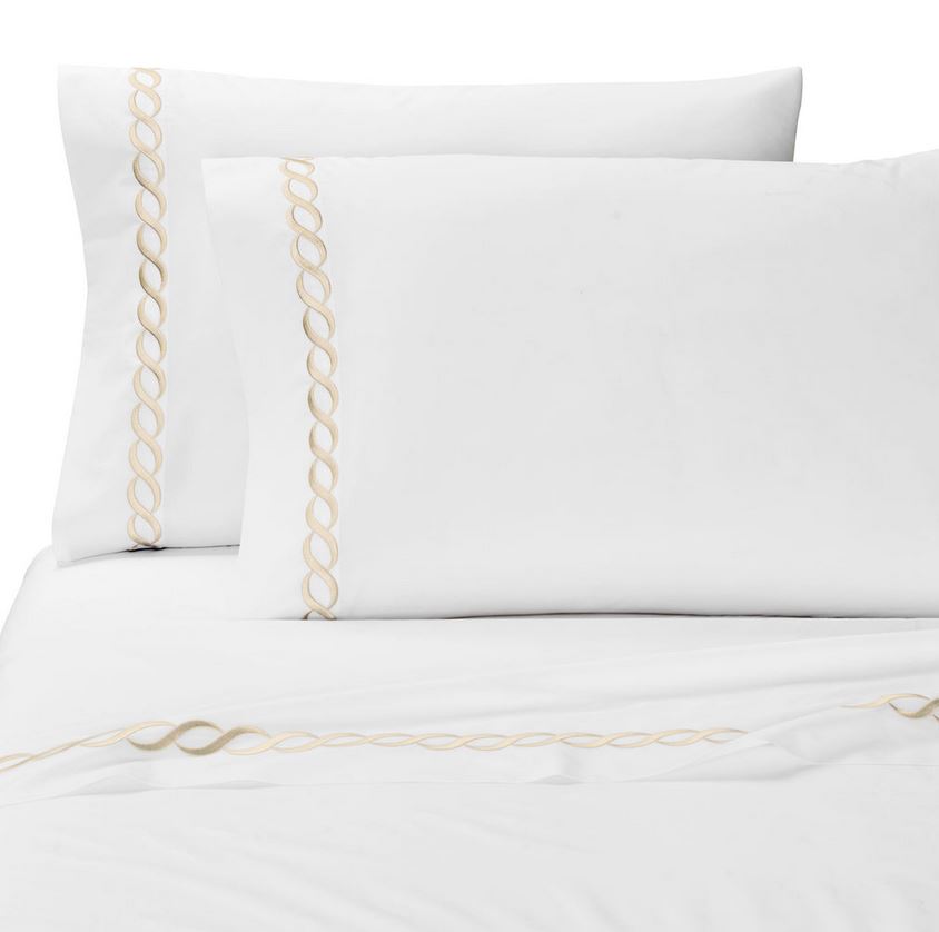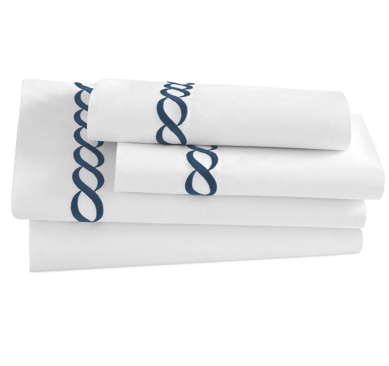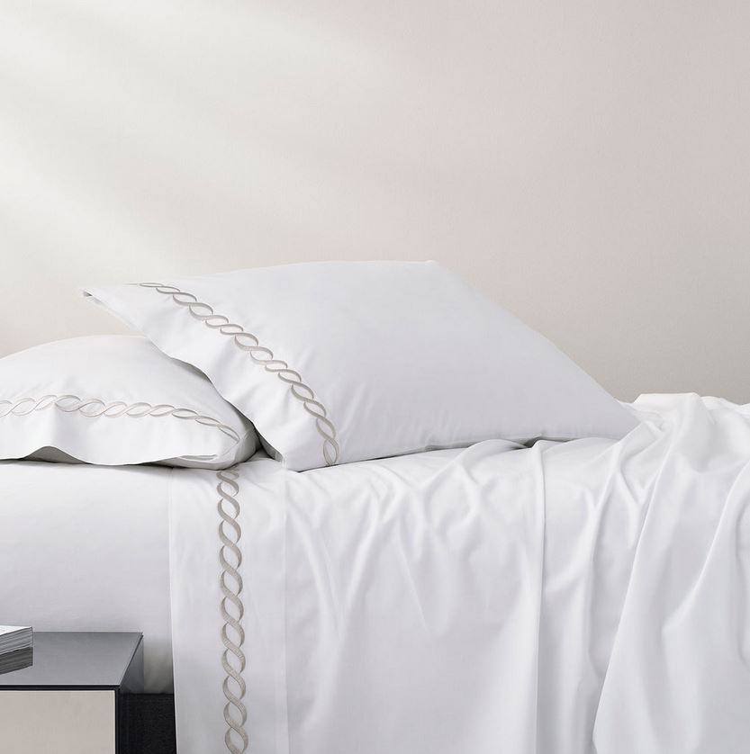 The Catena Embroidered Percale sheets from Kassatex is handcrafted with a blend of eucalyptus and long staple cotton and exquisitely embroidered with a classic cable design.
