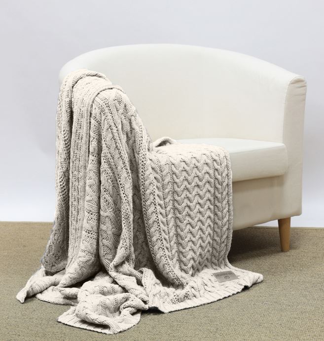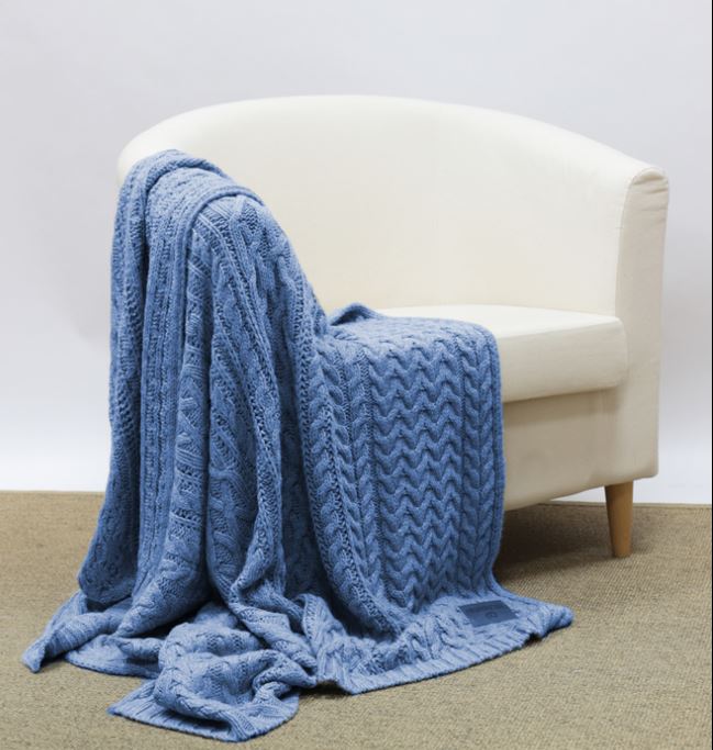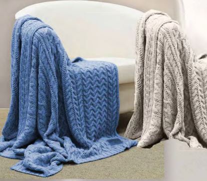 Luxurious cable knitted large throws are available in blue and ivory and are made of 85% Cotton and 15% Wool.
