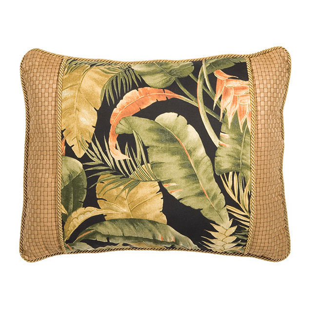 La Selva, a tropical delight filled with exotic plant life in warm colors of Green, Orange Mist, and Gold on a rich black ground with Gold cord. Another exclusive by Thomasville! Made in U.S.A.
