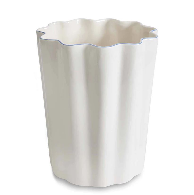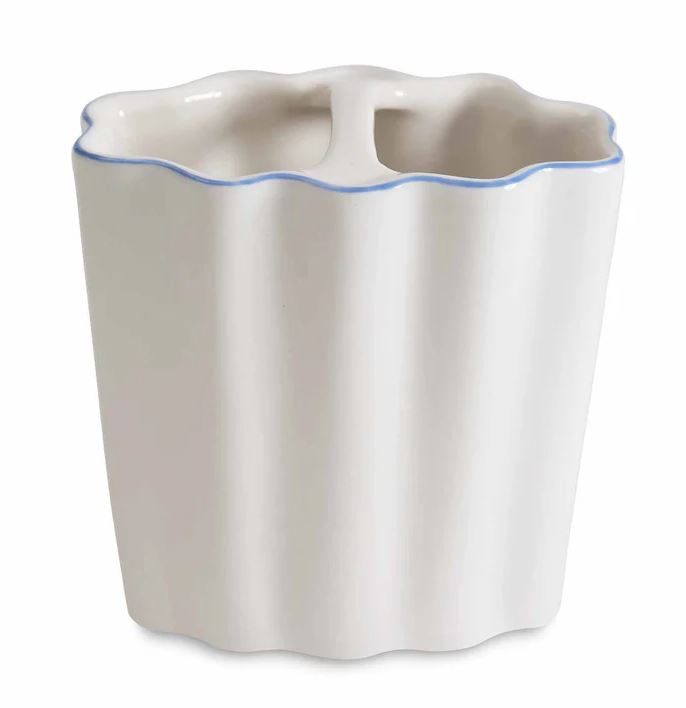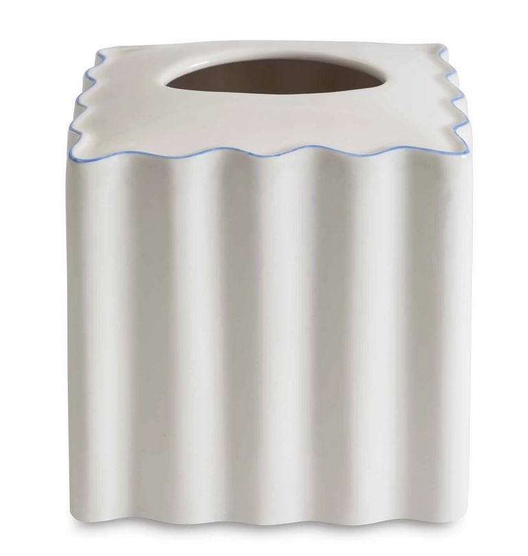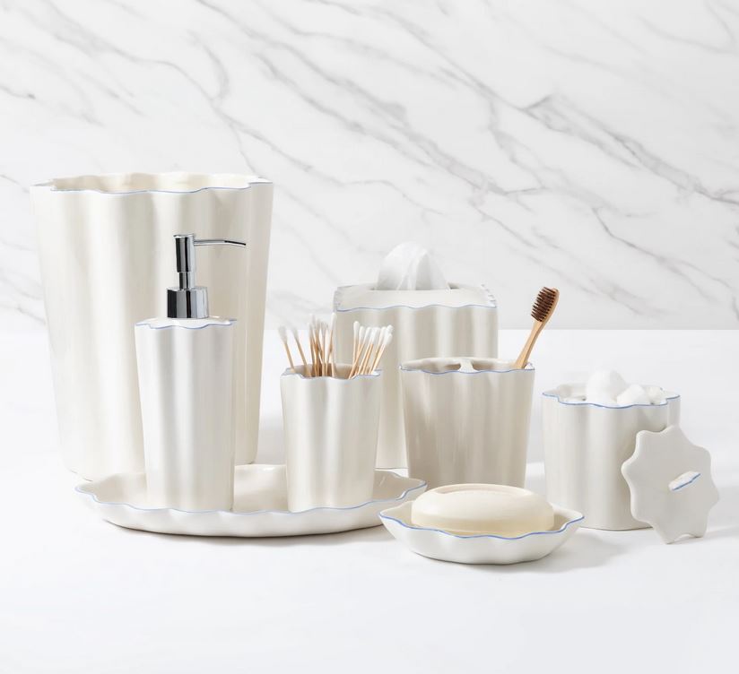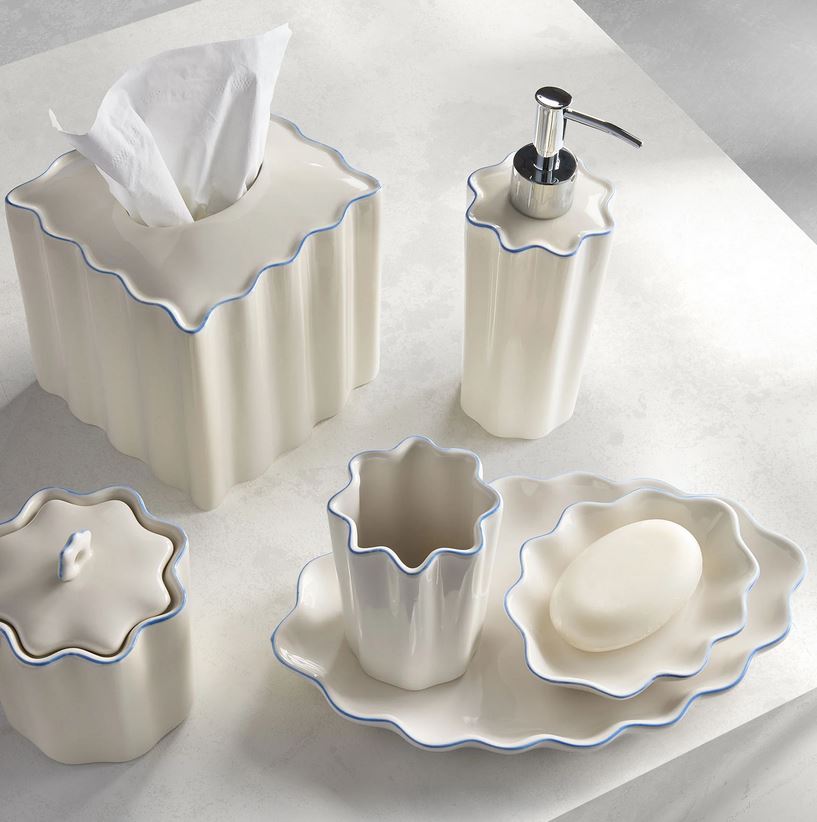 Crafted from cream-colored porcelain and featuring a whimsical scalloped design, the Le Marais collection from Kasstex is an elegant addition to any bath. Along the top of each collection piece is a subtle-trim detailing that further accentuates the scallop shape of this timeless accessory set. Imported.