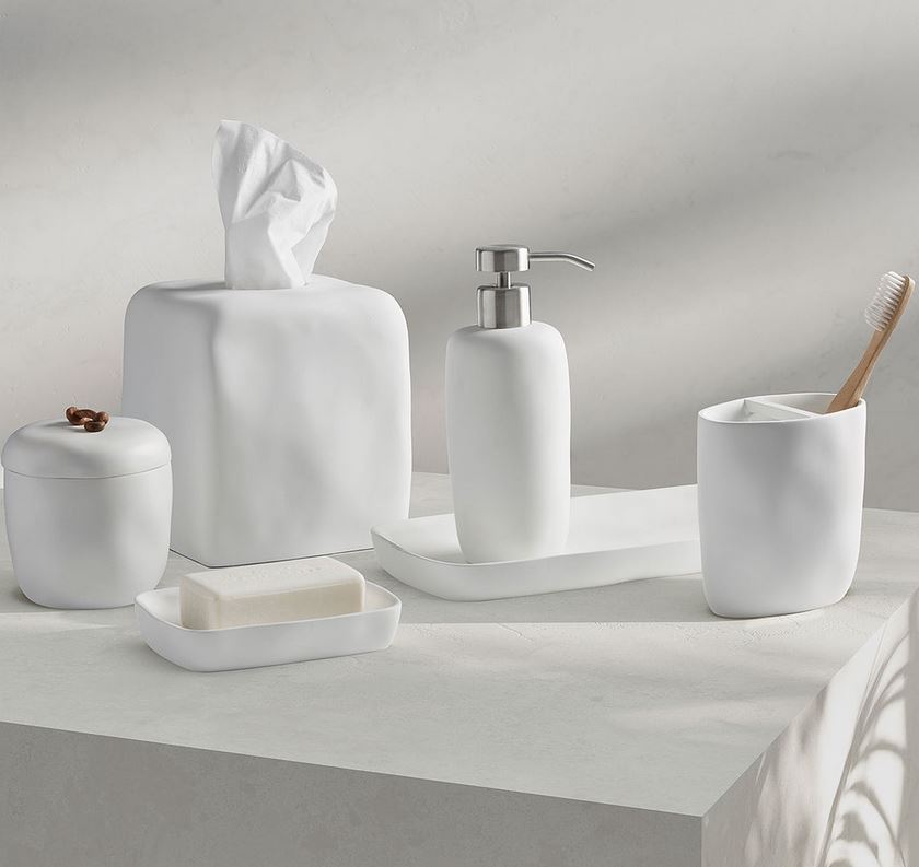Cotton Jar, Lotion Dispenser, Soap Dish, Tissue Box, Toothbrush Holder, Tray, Tumbler, Wastebasket