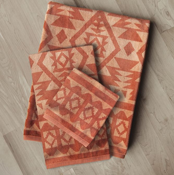 The Navajo Adobe Towel Collection by Carstens Inc. is a vibrant addition to your bathroom decor, featuring a southwestern design in a rich red hue that adds warmth and style to your space. This high-quality towel collection is soft, absorbent, and perfect for your bathing routine.