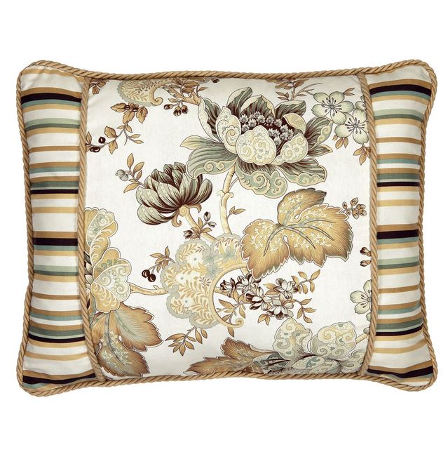 This 16″ x 20″ pillow features a vibrant floral main print accented by coordinating stripe bands on the sides. Made with a 100% cotton cover and filled with polyester fiber for ultimate comfort, it is both stylish and cozy. The twisted braid on the outer edge and inseams adds a sophisticated touch.