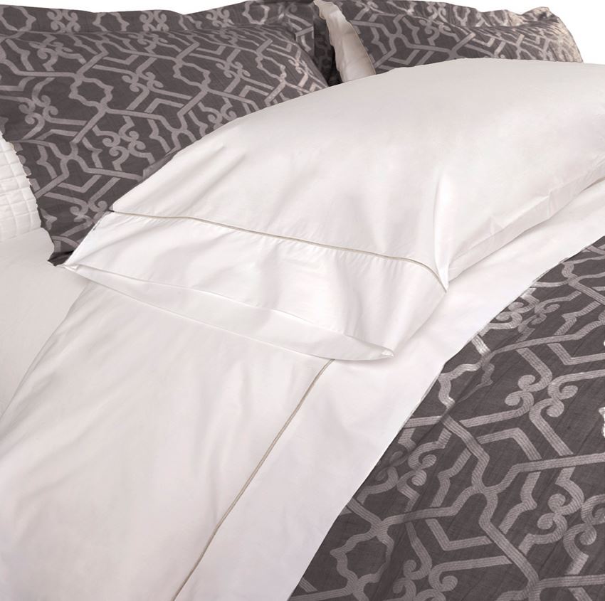 The Taylor Duvet Cover from DownTown Company is a luxurious and stylish bedding set featuring a blend of textures and fabrics. Made from Linen and Cotton Jacquard, providing a textured, elegant, and breathable surface. The reverse side of the duvet cover is a solid white percale sheeting, which is smooth, crisp, and cool to the touch—great for comfort against the skin.
