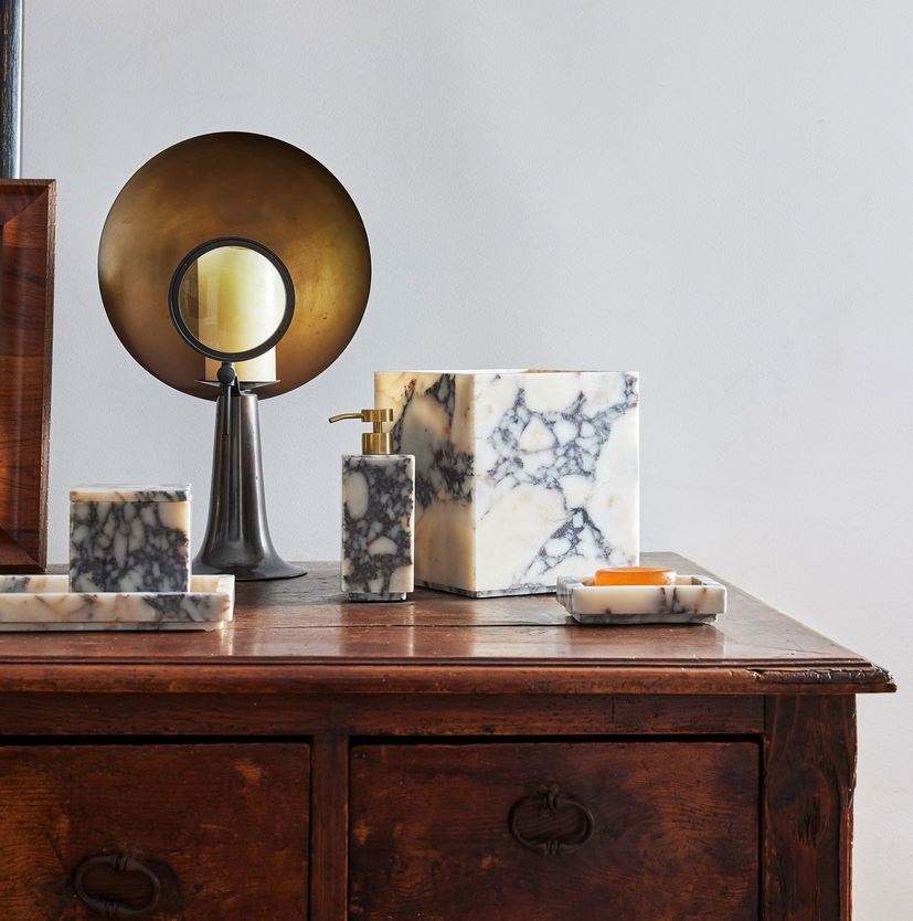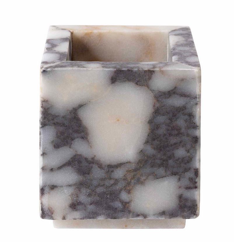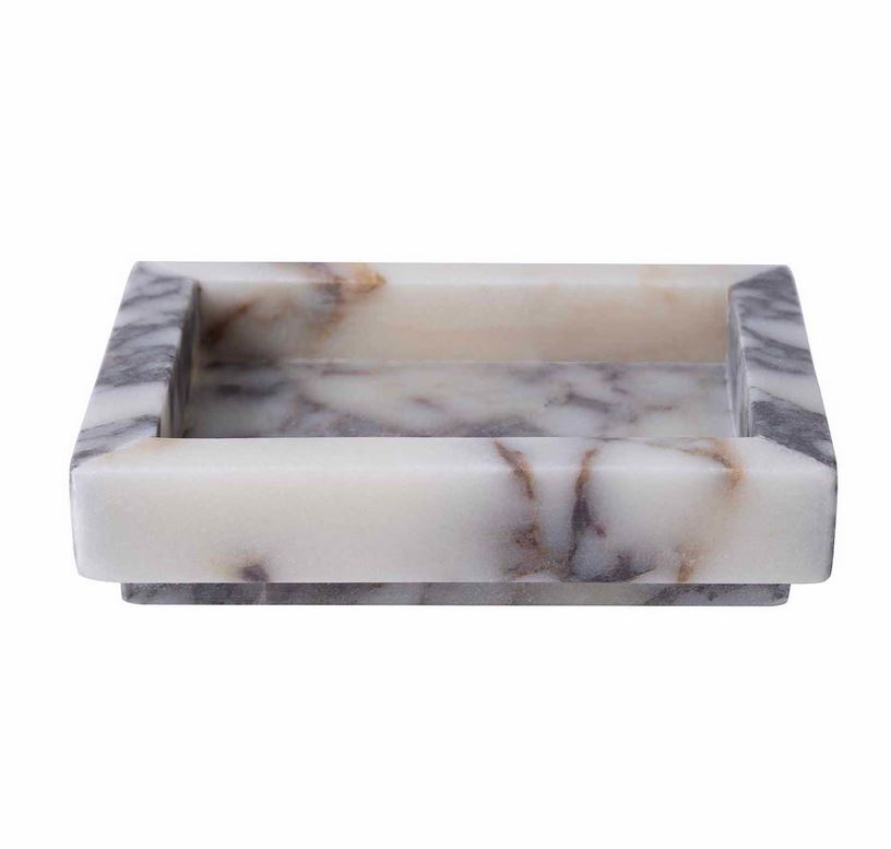 Drawing inspiration from the chiseled Greco-Roman sculptures decorating cities from Florence to Puglia, the Viola Collection from Kassatex, made from bianca viola marble, is simplicity redefined with its natural veining featuring sandy tones and hues of grey. This collection adds a touch of ancient spa to any space. Each accessory also features a small beveled platform, adding to this set’s captivating appeal. Not dishwasher safe.